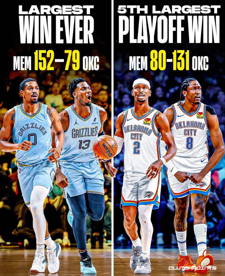 这场载入史册的屠杀创下三项里程碑:雷霆队史季后赛最大胜场分差(原纪录为2012年对独行侠的35分);NBA季后赛G1历史最大分差(超越2016年骑士38分胜活塞);季后赛历史第五大分差,与1995年魔术47分屠杀凯尔特人并列。历史前三席则由58分惨案(2009年掘金胜黄蜂、1956年湖人胜老鹰)和56分屠戮(1973年雄鹿胜勇士)占据。